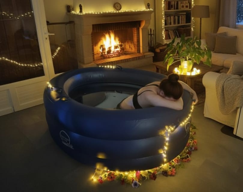 une pompe pour le gonflage, un liner jetable à usage unique, une bâche de sol, un tapis antidérapant, un thermomètre, un miroir, une épuisette, un tuyau avec ses adaptateurs pour le remplissage, ainsi qu’une pompe pour la vidange.